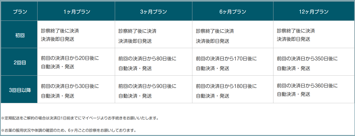 当クリニックのAGA治療プランは、全て定期配送便となります。